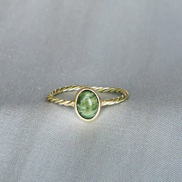 Een prachtige edelsteen ring met een groene Jade en een gedraaide band. Handgemaakt & 14k massief goud
