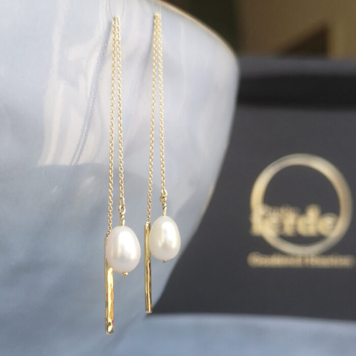 Beautiful long threader earrings with organic-shaped freshwater pearls and edgy, hammered details. Sold per pair. Send me a message if you’d prefer to have just one of them. These earrings are handmade & 14k solid gold ♥